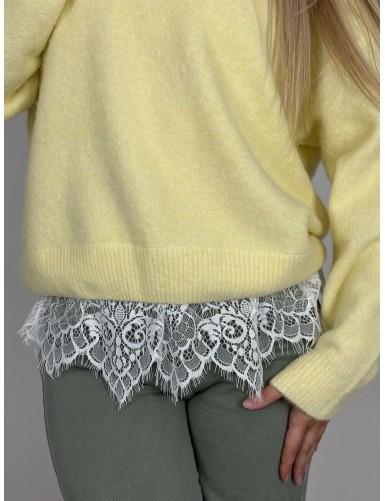 Pull col V à dentelles Coupe : droite  Matière : maille douce et chaude Manches : longues manches  Détails  : dentelles Couleur : jaune...