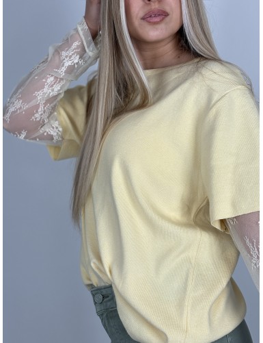 Pull col rond Coupe : droite  Matière : maille douce et chaude Manches : longues manches et transparentes Couleur : jaune Composition : 50%...