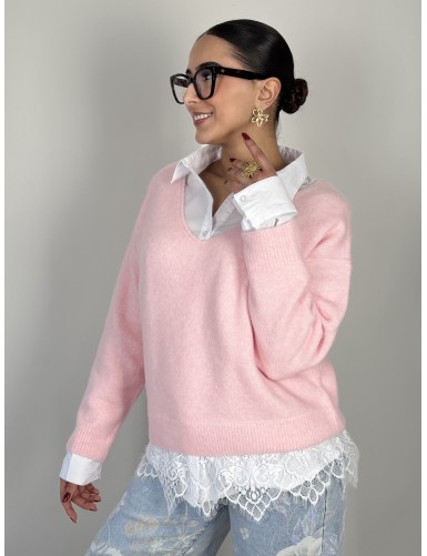 Pull col rond à dentelles Coupe : droite  Matière : maille douce et chaude Manches : longues manches  Détails  : dentelles Couleur : rose...