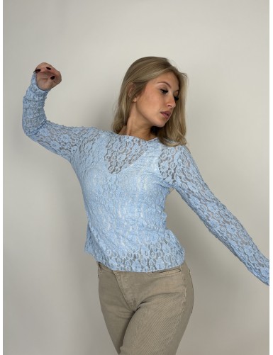 Pull col rond à dentelles Coupe : droite  Matière : maille douce et chaude Manches : longues manches  Détails  : dentelles Couleur : bleu...