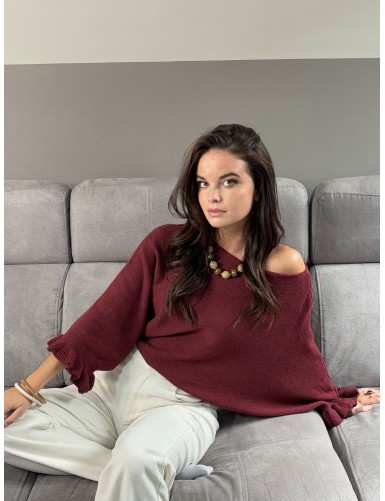 Pull col rond Serrage possible par devant  Couleur : bordeaux Composition : 50% viscose, 25% modal, 25% polyamide La mannequin mesure 1m68 et...