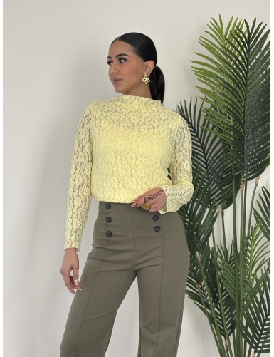 Pantalon style patte d'éléphant Coupe : ample Détails : boutons Couleur : kaki Composition : 65% viscose, 30% nylon, 5% élasthanne  La mannequin...